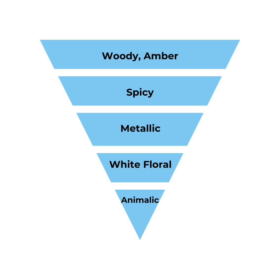 This car freshener features an amber floral fragrance with accords of woody, amber, warm spicy, fresh spicy, aromatic, metallic, white floral, and animalic notes.