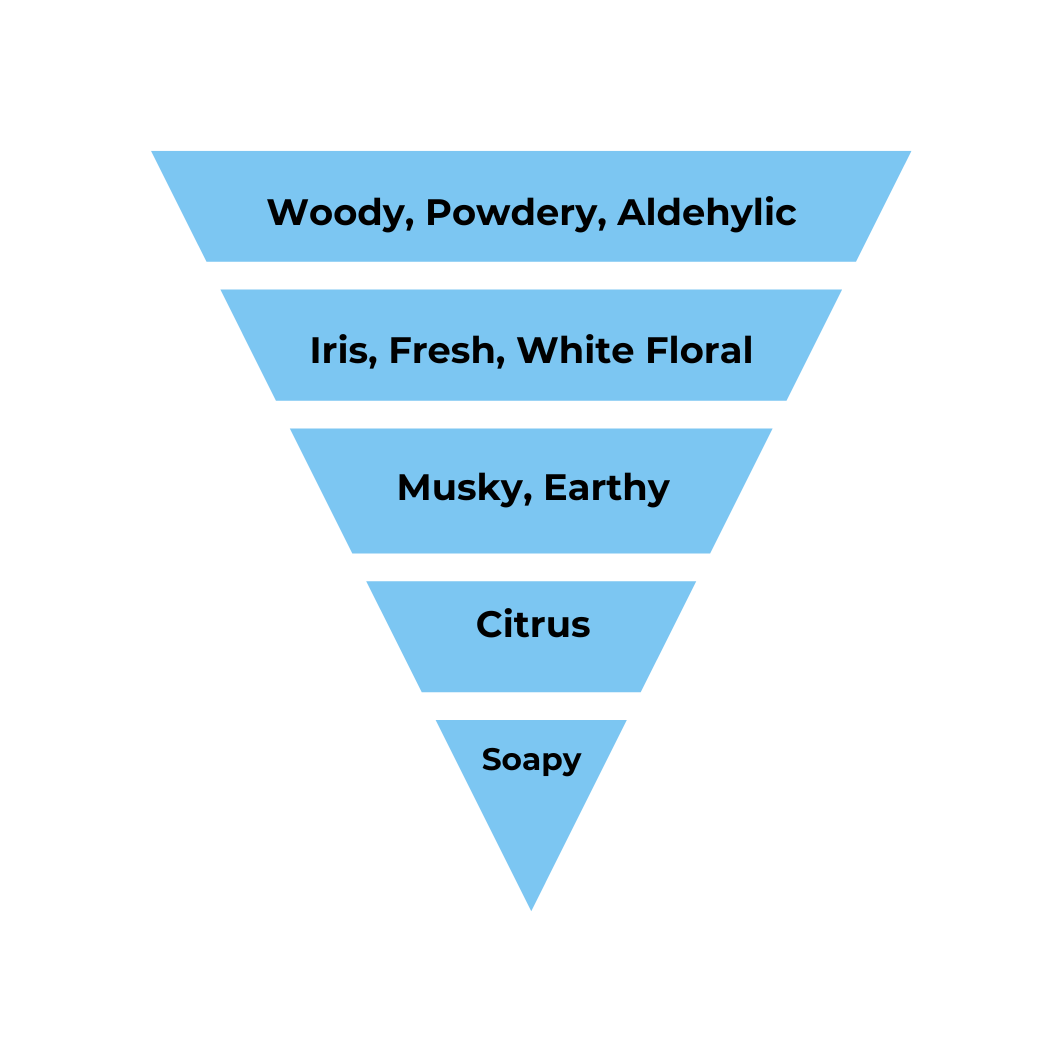 Floral fragrance with accords of woody, aldehydic, fresh, white floral, powdery, earthy, yellow floral, iris, citrus, and floral notes.