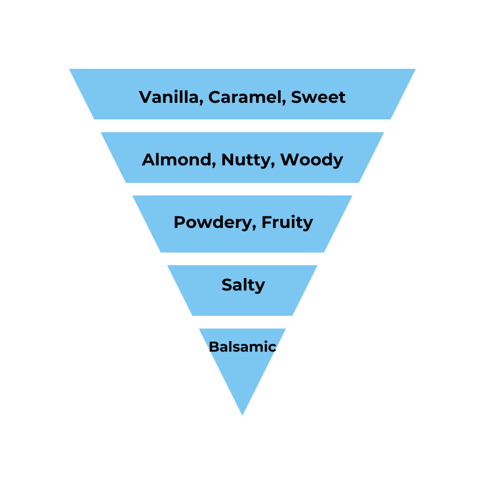 Amber Vanilla fragrance with accords of vanilla, caramel, almond, sweet, nutty, woody, powdery, salty, fruity, and balsamic notes.