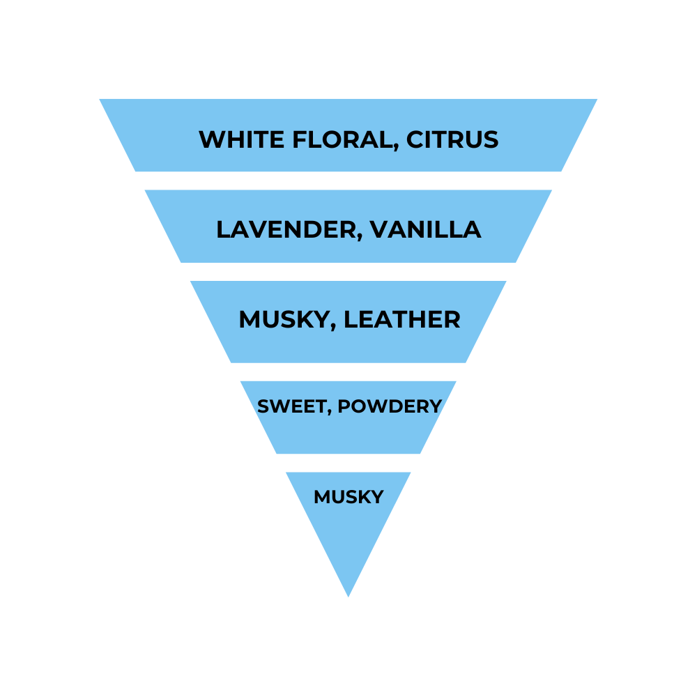 White florals, citrus, lavender, musky, vanilla, powdery, sweet, animalic, aromatic, and fresh spice.
