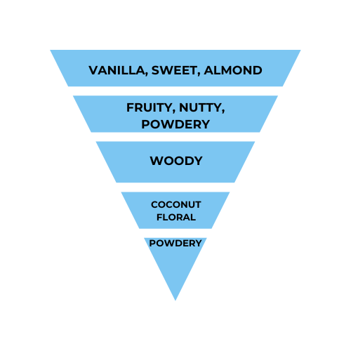 Accords of vanilla, sweet almond, fruity, nutty, powdery, woody, coconut, white flora, and balsamic notes.